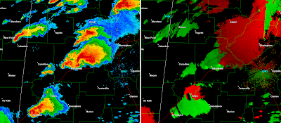 The left half of each image shows the radar returns in "reflectivity" mode, which refers to rain, hail, etc. being reflected back to the radar site. The right half of each image shows the radar in "velocity" mode, which refers to the wind speed & direction within a thunderstorm. Remember, when examining the velocity data, reds show wind motion away from the radar, while greens show wind motion toward the radar site. On the images below, the radar site is located toward the right, center portion of the screen, as noted by the "KBMX" in light blue.