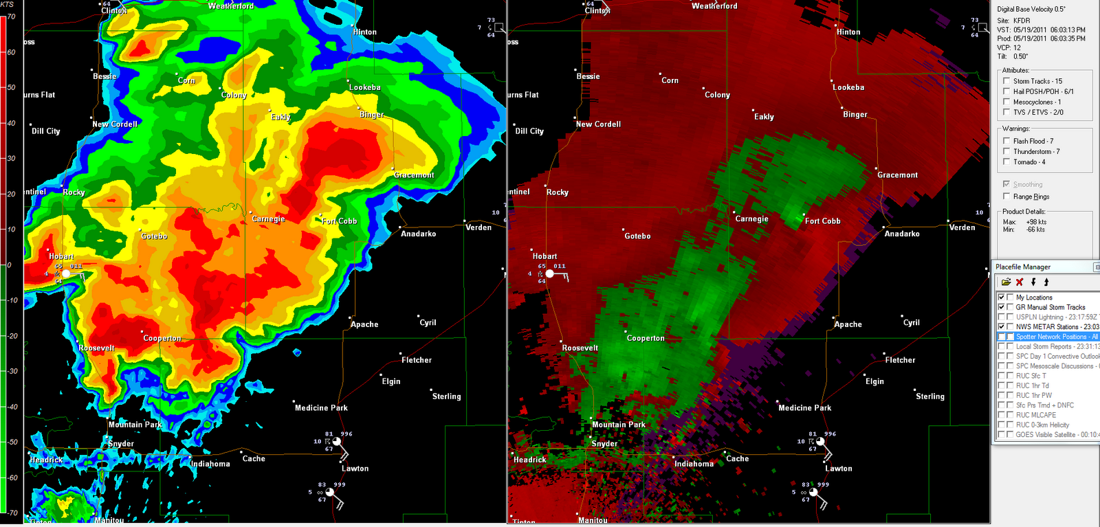 The above image was just taken from the Frederick, OK area radar. The left half of the image shows the radar in reflectivity (rain, hail, etc.) mode, while the right half shows the radar in velocity (wind speed/direction) mode. There are two tornadic circulations on the images, according to radar. One is very near Ft. Cobb, and the other is directly East of Cooperton.