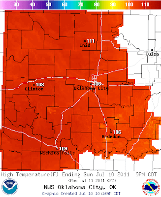The above image shows the observed high temperatures across the Sooner State on Saturday. It was a scorcher indeed, with several stations exceeding 110 degrees!